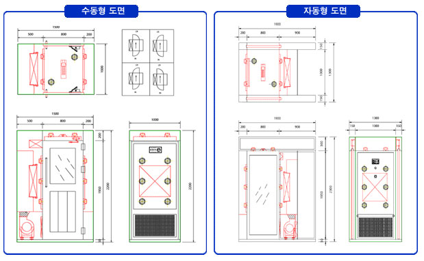 또한, 입실인원이 많은 경우나 현장 여건상 입,출구 Door를 Auto Door로 제작하기도 하며, 입구측Door를 설치하지 않고 Air Curtain으로 연속 Air를 분사함으로써 실내,외 기류의 역류를 방지하기위한 방법 등 여러 가지의 사양도 제작한다.