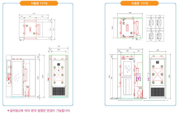 | AIR SHOWER를 토탈크리닝과 더불어 사용하면 더욱 더 완벽한 효과를 얻을 수 있습니다. 당사에서는 수요자님들의 주문에 의해 서 다양한 규격 및 TYPE으로 제작하며 성심껏 납품하며 드리오니 당사의 제품을 많이 이용하며 주시면 감사하겠습니다. |