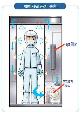 | 철저한 위생이 요구되는 생산 LINE에 입실할 때는 의복등에 부착되어있는 오염 물질이 실내로 유입되지 않도록 입구에 AIR SHOWER를 설치하며 위생복을 착용한 입실자가 필요한 시간 동안 청정 공기로 세정한 후에 입실합니다. |
